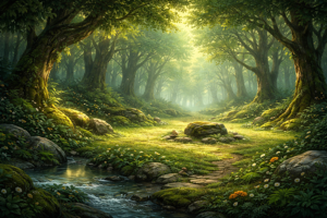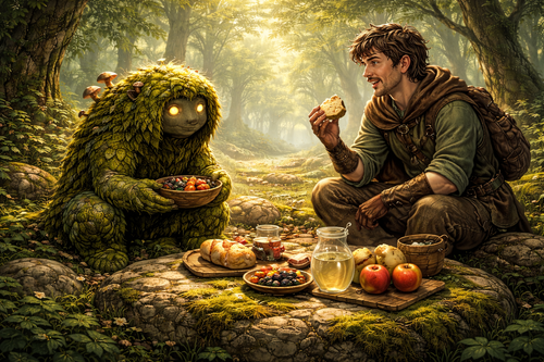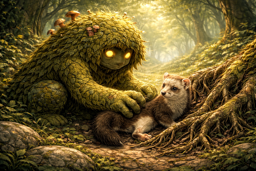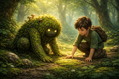Tú permanecías cerca, casi inmóvil, con el cuerpo cubierto de musgo fresco y pequeñas hojas aún húmedas por el rocío. Tú, Mossling, sentías el pulso del claro en cada fibra: el temblor lejano de un insecto al despegar, el crujido de una rama acomodándose, el agua moviéndose con cuidado para no alborotar a nadie.