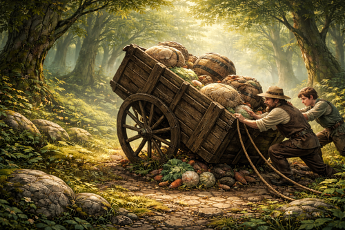 Pero ocurrió: la rueda se partió. La madera crujió con un lamento largo y áspero, y el carro se inclinó de golpe hacia un lado. Escuché el tintineo del metal, el golpe hueco de los barriles soltándose, el arrastre torpe de los paquetes al perder el equilibrio. El sendero, que hasta ese momento había sido solo un trazo tranquilo entre árboles, se llenó de movimientos violentos.