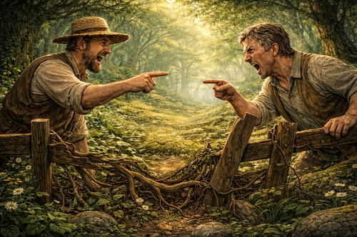 Los vi desde detrás de un seto bajo: dos vecinos del claro exterior, con las mejillas enrojecidas y los gestos amplios, señalándose mutuamente como si se necesitase aclaración para entender a quién culpaban. Entre ellos, una sección de valla de madera torcida, claramente dañada por algo más pesado que una cabra…