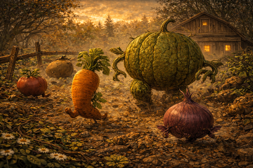 Una calabaza chocó contra mi pierna y rebotó sin fuerza. Se quedó quieta. Luego otra verdura frenó. Y otra más. Las zanahorias dejaron de rodar y comenzaron a hundirse lentamente en la tierra, como si de pronto recordaran que pertenecían allí. Las hojas se marchitaron apenas un poco, lo justo para perder rigidez. Los nabos dejaron de saltar y se acomodaron en el suelo con un suspiro casi audible.