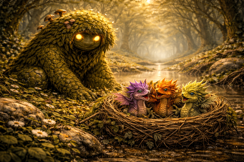 Un pequeño nido, oculto entre flores de pétalos anchos y colores imposibles, donde tres dragones florales jóvenes dormían enroscados unos con otros. Sus cuerpos eran pequeños, apenas más grandes que una mano, y sus escamas parecían pétalos endurecidos, translúcidos a contraluz. Cada respiración liberaba una nube tenue de polen brillante que se asentaba lentamente sobre el suelo.