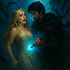 Y entonces todo se precipitó. Dagon Sacó una daga de su cinturón, las llamas azules se elevaron como una marea enloquecida, las inscripciones en las paredes brillaron con una luz espectral… y la daga de Dagon encontró su objetivo. Se hundió en la carne de Lysandre con un sonido seco y cruel.