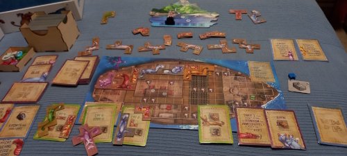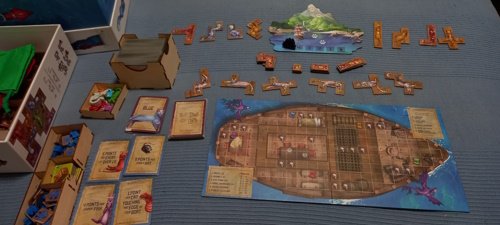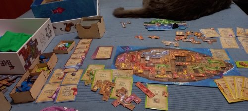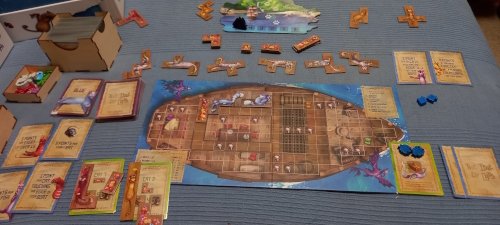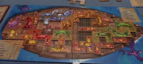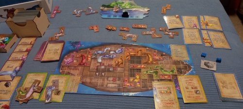 Colocamos el tablero de isla, con cuatro gatos a cada lado, los tesoros y los Oxah debajo, las cartas de la hermanita y mi tablero de jugador. He escogido el tablero de dragones. ¿Por qué? Porque cualquier cosa con dragones siempre es bien. Además, ¡las ilustraciones de los peces-dragón son preciosas!