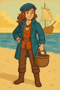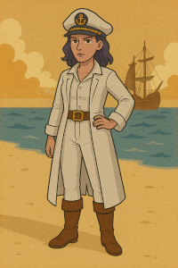Este es nuestro personaje: Mira Lune, capitana del Buen Augurio. Sus manos están curtidas por el mar, pero su mirada… esa mezcla de ternura y decisión firme deja claro que Mira no abandona a nadie, ni siquiera a los más ariscos felinos de la isla.