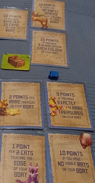 Mira no tiene ratas en su barco, por lo que no le restan puntos, pero tiene 5 habitaciones no completadas, por lo que se le restan 25 puntos. En total le quedan 45 puntos, mientras Lysadra suma un total de 59 puntos.