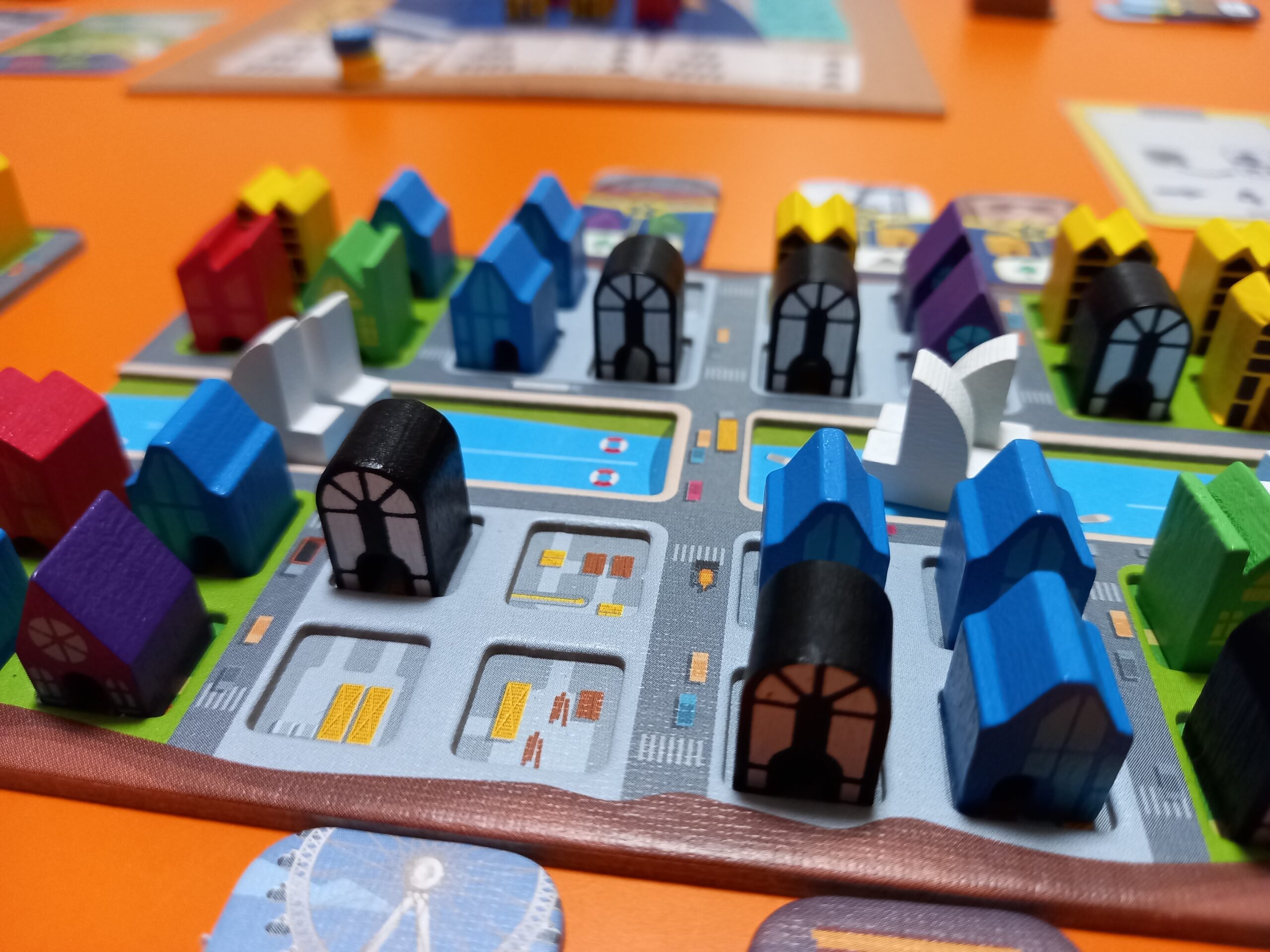 Yo sigo con mi solitaria Torre Eiffel mientras que AIDA ya cuenta con cuatro monumentos en su barrio: un faro, un arco del triunfo, un monumento al meeple de Lincoln y una cosa grande como de cables de alta tensión (eso no sé lo que es).