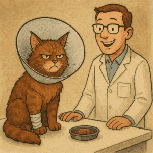 Cuando paramos, vi que había puesto el transportín sobre la mesa del veterinario. Y ahí, enfrente de mi, estaba él enseñándome todos sus dientes, con lo que los humanos llaman una sonrisa, y diciendo cosas con una voz melosa, como si yo fuese un bebé. Estaba muy nervioso. No quería salir del transportín. Tenía dos opciones: o dejar cao a ese señor de dientes blancos, o ceder y salir. Pensé que lo mejor sería salir, porque lo otro sería meterme ya en demasiados problemas. Además, me habían puesto una lata de comida que olía de maravilla al otro lado de la mesa… Asi es que, recordando las palabras de mi antiguo amor, decidí salir del transportín con dignidad y sin cojear, y comerme tranquilamente ese rico paté.