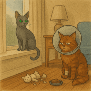 Por fin se han convencido de que ya estaba bien y me han quitado esa cosa de la pata y del cuello. Cuando hemos vuelto a casa, el humano mocoso había empeorado y su compañera ha decido llevarlo a su veterinario. Con el jaleo de salir corriendo han olvidado dejarme encerrado en casa y por fin he podido salir tranquilamente.