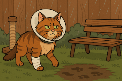 Al entrar en casa de vuelta, he dejado algo de barro por el camino porque fuera está lloviendo y no todo es hierba en nuestro jardín. Mis humanos han visto el rastro y han deducido que he sido yo, que he salido fuera. Han cerrado todo con llave para que no vuelva a escapar hasta que esté recuperado, y encima se han mosqueado porque lo he ensuciado todo. ¡Como si fuese mi culpa que ellos tengan el jardín lleno de barro! Si no lo mantienen en buenas condiciones no es mi culpa que todo se manche. Es más, yo tendría que estar mosqueado porque me he llenado todas las patas de barro, y luego sabe fatal.