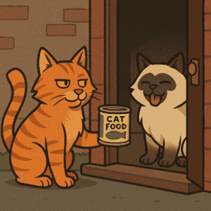 Cargado con la comida que llevo, me acerco a la guarida de los Pelosos Peligrosos simulando ser un repartidor. Le digo al gato que está de guardia que me envían desde la sede con un regalo para él, y le enseño la lata de comida que llevo conmigo. Los ojos se le iluminan y comienza a salivar. Esto va bien. Le comento que es una pena que en el puesto de trabajo no pueda comer, porque tiene una pinta estupenda… y me ofrezco a sustituirlo si me da un bocadito para que él pueda comerse el resto tranquilamente. ¡Estos himalayos son extremandamente confiados! En su defensa tengo que decir que parecía muy joven. El pobre, la que le va a caer encima es monumental.